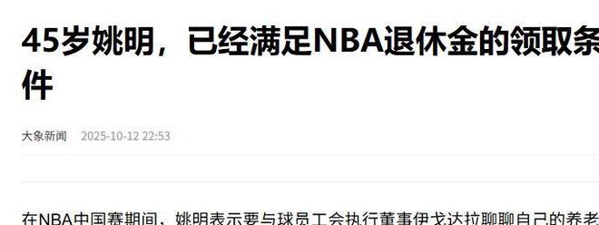 大象新聞:(45歲姚明,已經(jīng)滿足NBA退休金的領(lǐng)取條件2025.10.12)