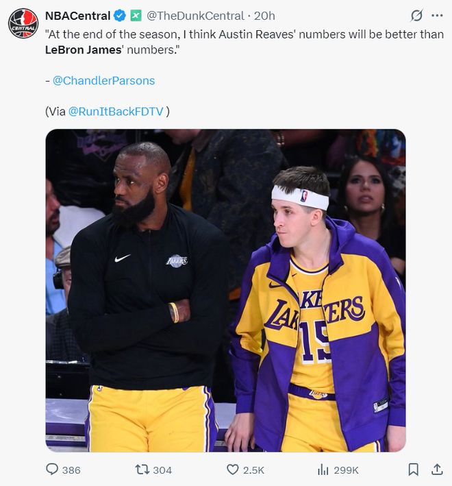 奧斯汀-里夫斯在開(kāi)賽階段打出了超巨表演,場(chǎng)均38.2分鐘,拿到34.2分10助攻5.6籃板1.8搶斷,隨后帕森斯就在播客節(jié)目說(shuō)表示:我認(rèn)為賽季結(jié)束時(shí)里夫斯的數(shù)據(jù)會(huì)比詹姆斯更好。隨后就有人評(píng)論,40歲的勒布朗復(fù)出會(huì)拖累這支湖人,因?yàn)橐粋€(gè)球不夠玩,湖人不需要三個(gè)持球手。