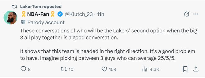 湖人記者對(duì)此進(jìn)行了回應(yīng):當(dāng)三巨頭同時(shí)在場(chǎng)時(shí),誰(shuí)會(huì)成為湖人的第二選擇這個(gè)討論很有意思,這說(shuō)明這支球隊(duì)正朝著正確的方向前進(jìn),想象一下有三位場(chǎng)均25+5+5的球員是怎樣甜蜜的負(fù)擔(dān)?