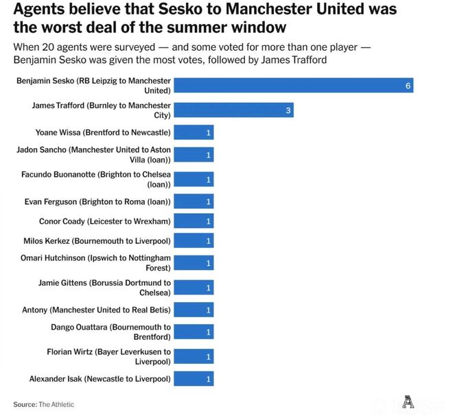 北京時間10月13日,權(quán)威媒體The Athletic發(fā)布了2025年經(jīng)紀(jì)人調(diào)查,該調(diào)查分析了這個創(chuàng)紀(jì)錄的英超夏季轉(zhuǎn)會窗口,本次調(diào)查邀請了20位經(jīng)紀(jì)人回答相關(guān)問題。其中,在關(guān)于夏窗最差引援的評選中,曼聯(lián)前鋒謝什科拿到6票,成為得票最多的球員。而在夏窗最佳引援的評選中,曼城門將多納魯馬拿到5票,排名第一。