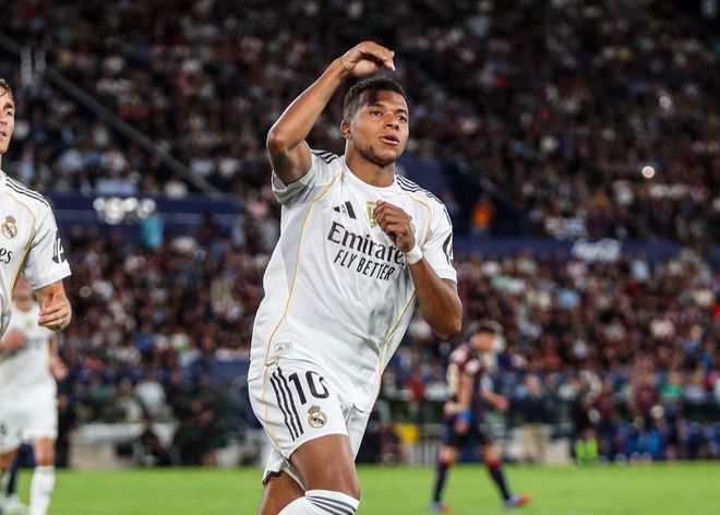 雷速體育10月26日訊 西甲聯(lián)賽第10輪西班牙國(guó)家德比,比賽第22分鐘,姆巴佩接貝林厄姆直塞單刀破門,幫助皇馬首開記錄。